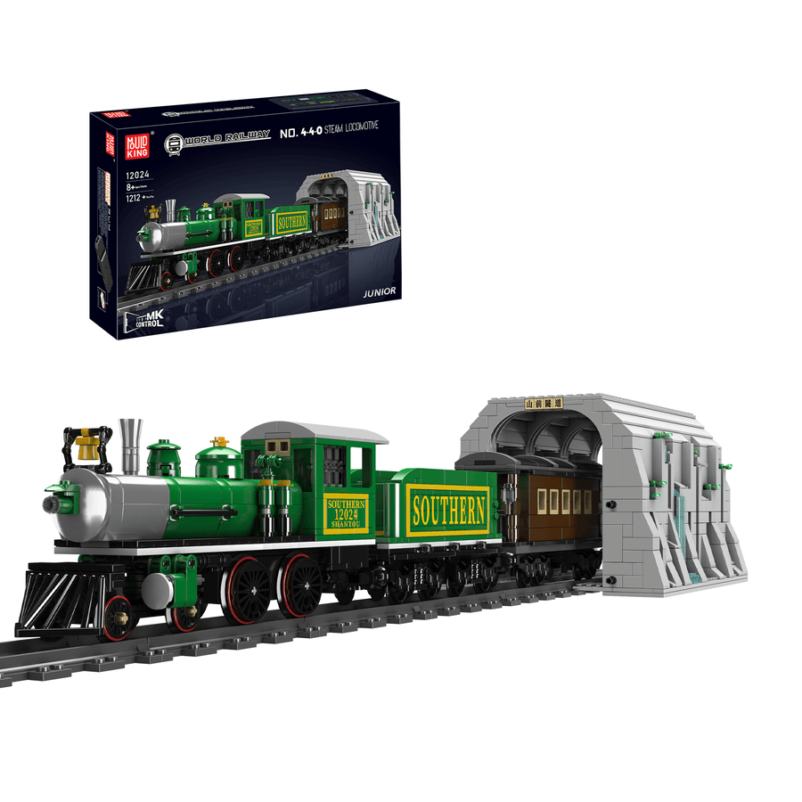 Build a real-looking, remote-controlled steam train with 1212 bricks! It's a 4-4-0 steam locomotives. The set also comes with a detailed brick mountain tunnel. You'll see train tunnels, cliffs, and green trees on it. And the best part? With a power module, you can control the train from afar. Watch it go on the brick tracks and through that cool mountain tunnel!