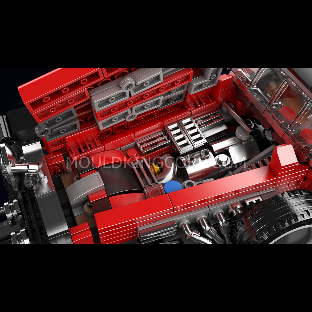 The black and red color scheme enhances its stylish appearance, while the spare tires mounted on the sides add a realistic feel. This set is perfect for car enthusiasts and building lovers alike.