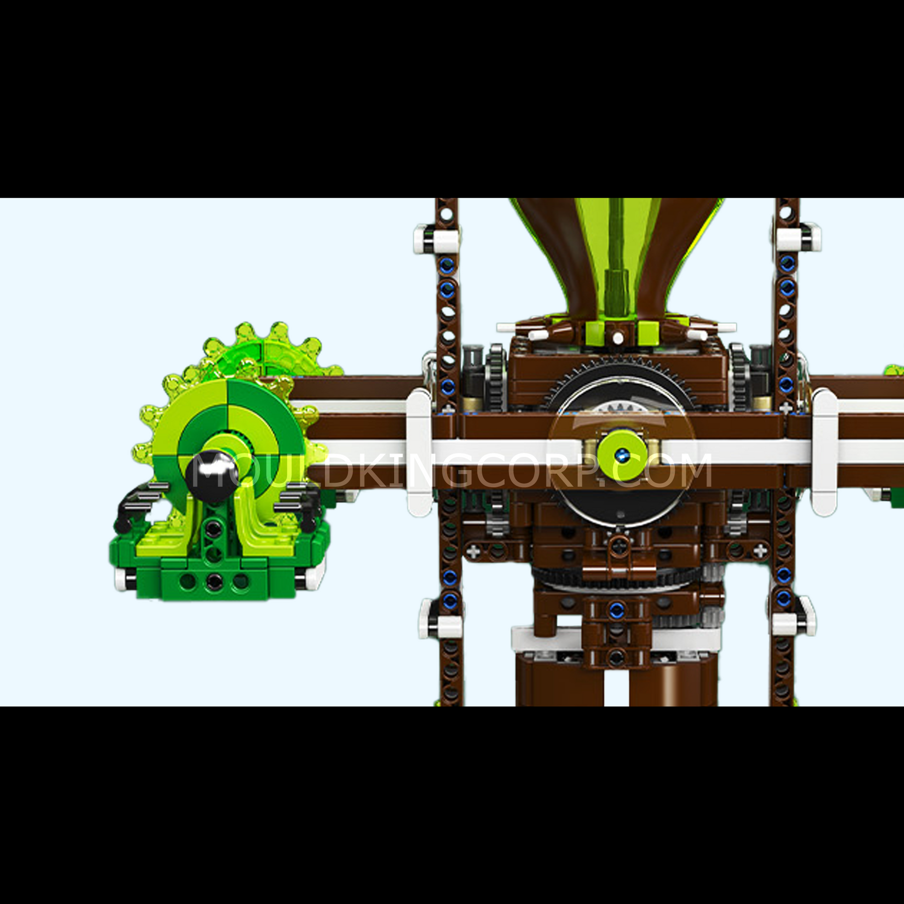 Standing 38 cm tall and built from 2,148 precision-molded bricks, this set recreates a large rotating ride powered by a motorized gear system. At its heart is a striking green tree bulb, mounted on a tall rotating trunk, symbolizing clean energy from nature. When activated, the XL motor drives the central shaft, turning the branches and rotating the passenger seats in rhythmic motion—just like a real theme park ride.