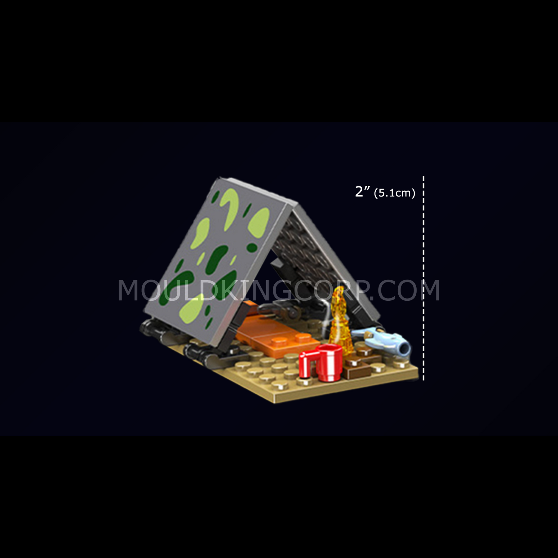 A small expedition camp sits near the jungle edge, complete with a tent, campfire, and tools. It builds a cozy storytelling space—ideal for imagining late-night research, survival moments, or encounters with roaming dinosaurs.