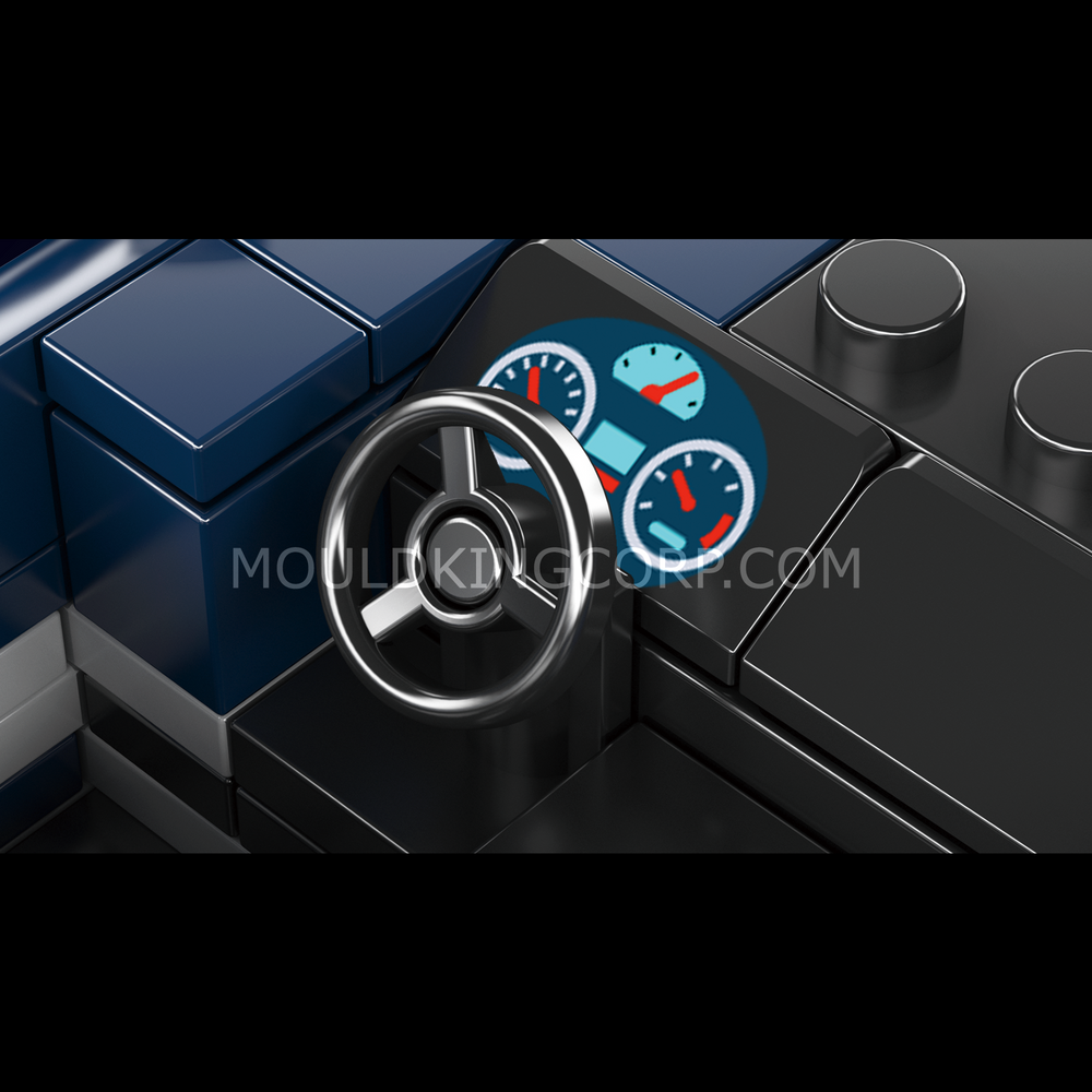 Das Cockpit verfügt über ein detailliertes Armaturenbrett, Rennsitze und ein Lenkrad. Die transparente Windschutzscheibe ermöglicht eine uneingeschränkte Sicht in den Innenraum.