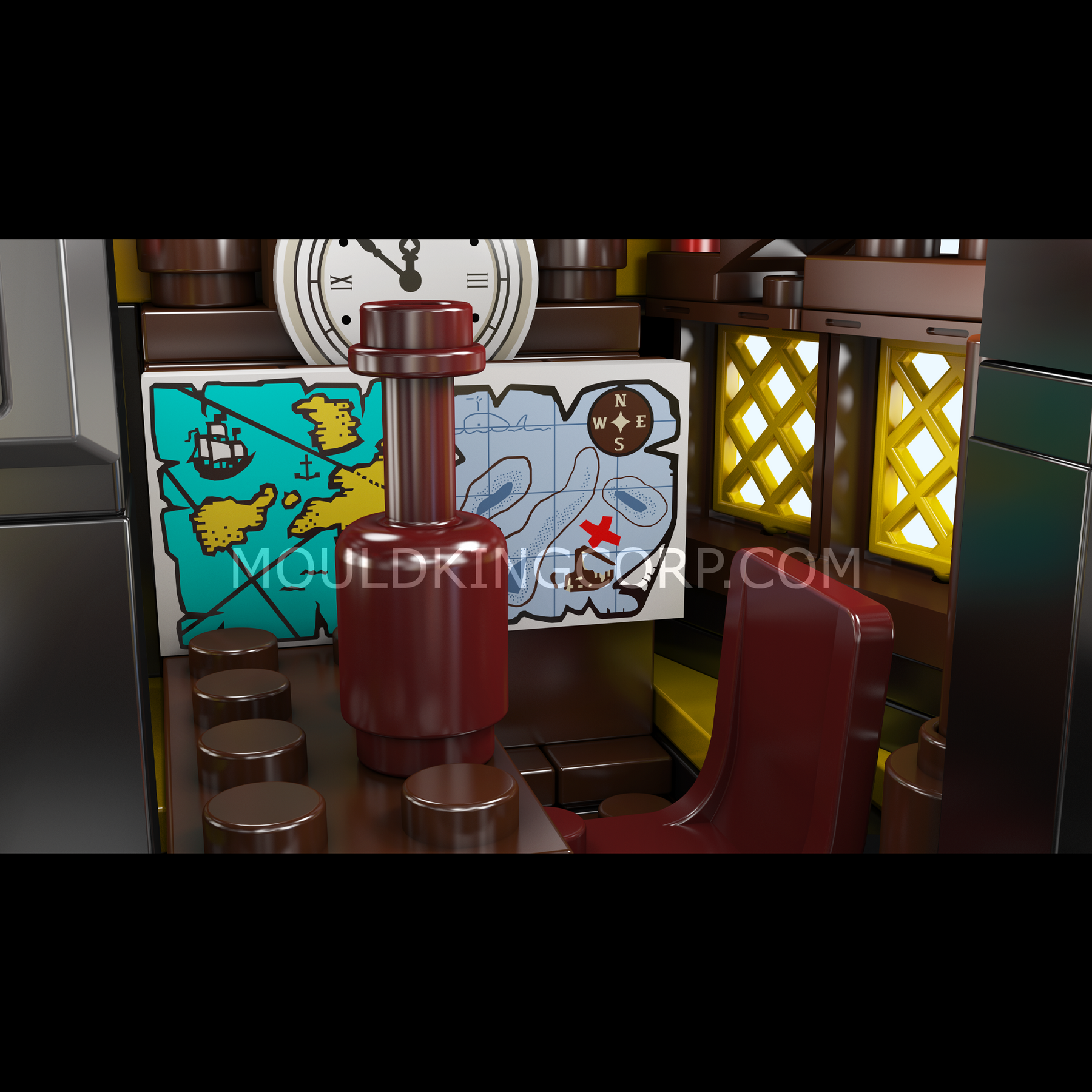 In der Kapitänskajüte runden ein detailreicher Navigationstisch, eine Schatzkarte und Fässer die Szenerie ab. Die skelettartige Galionsfigur am Bug verstärkt das furchterregende Aussehen des Schiffes.