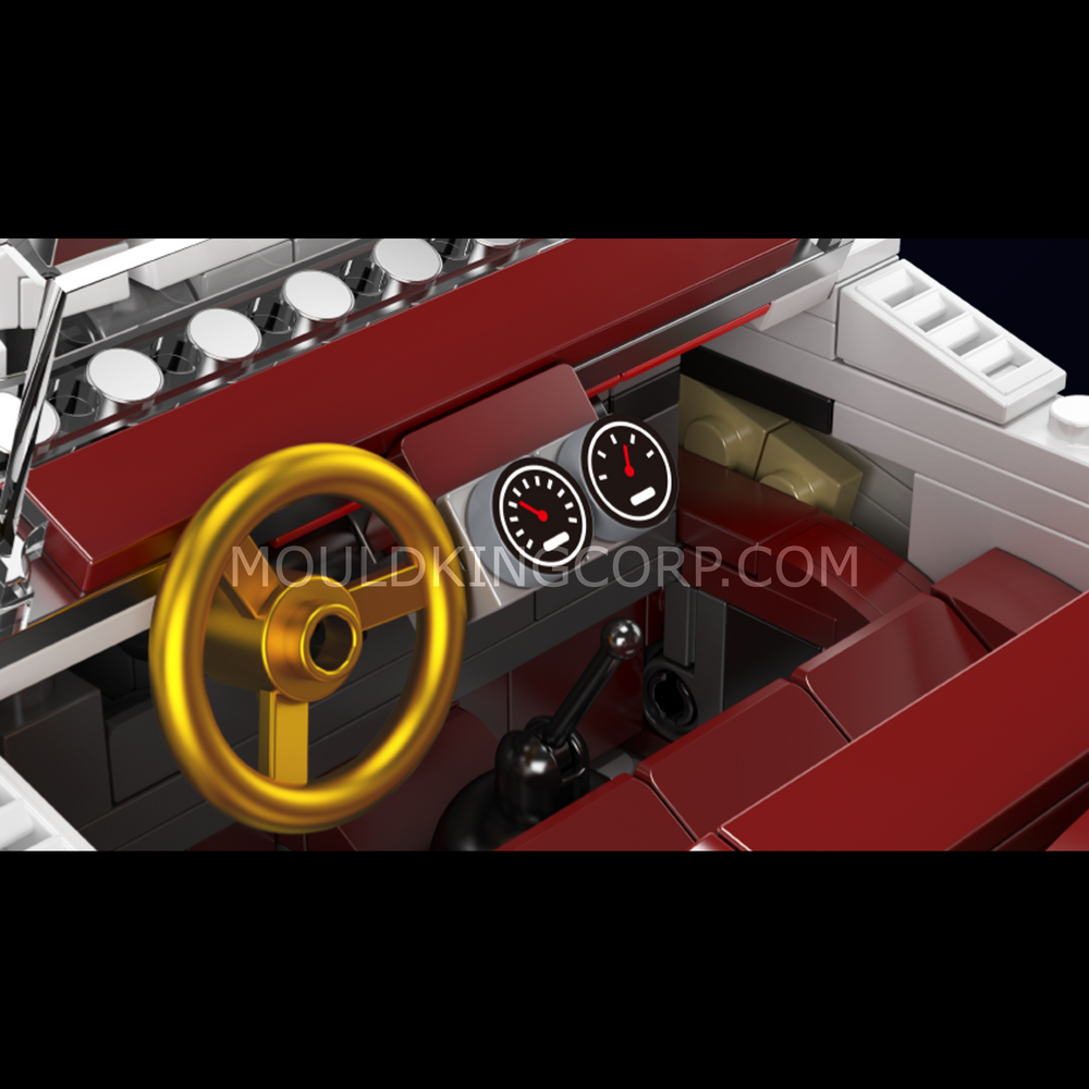 Bewonder de brede spatborden, de retro grille en de kenmerkende dubbele koplampen die het naoorlogse autodesign definieerden. De auto heeft een rijkelijk gedetailleerd rood interieur, compleet met een goudkleurig stuurwiel en analoge wijzerplaten op het dashboard.