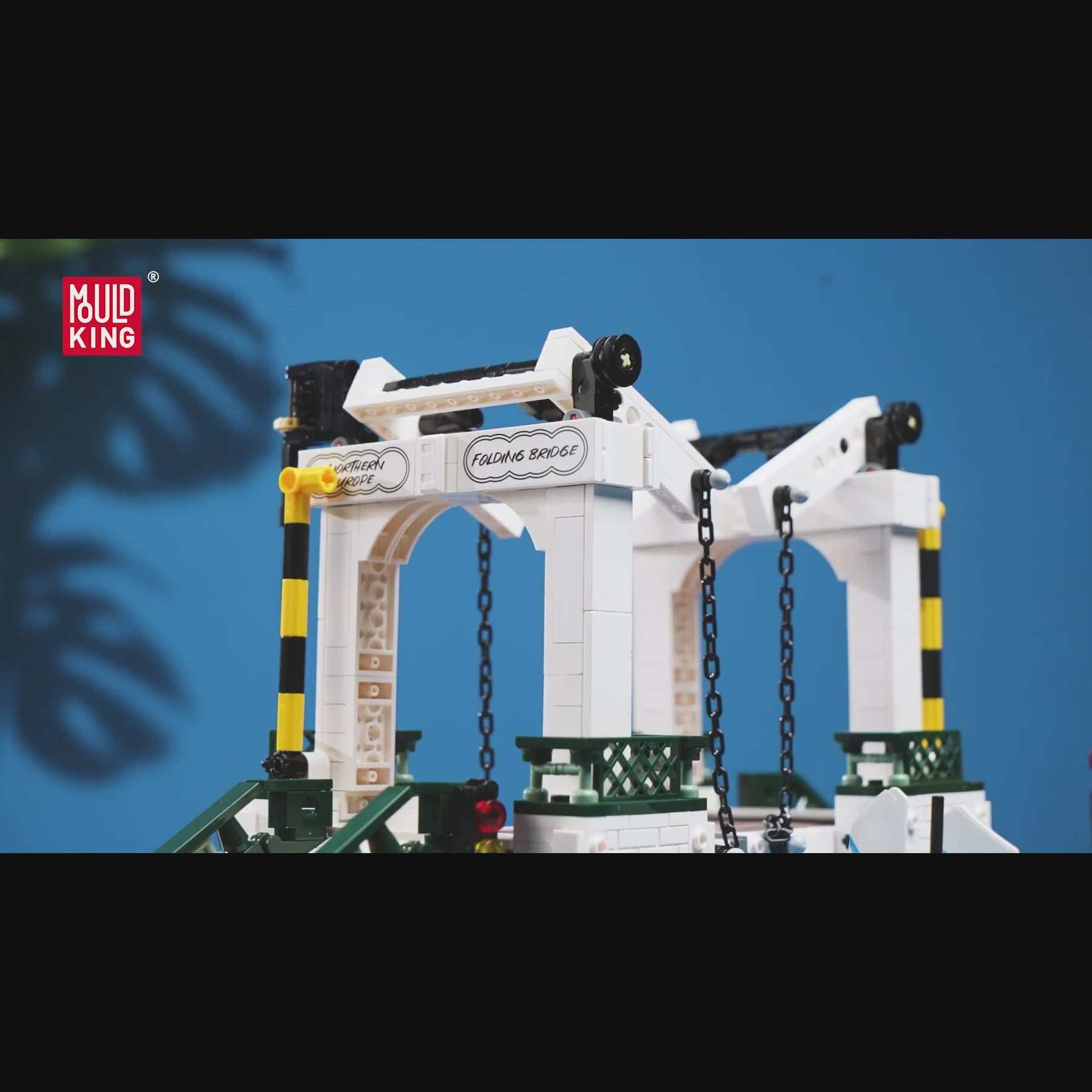 Deze gedetailleerde set heeft een functionele ophaalbrug die wordt aangedreven door 2 M-motoren en een batterijdoos, waardoor je met een druk op de knop de brug op en neer kunt bewegen.